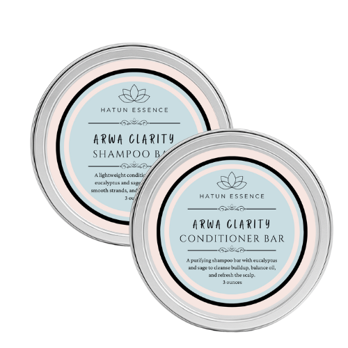 The Arwa Clarity Duo brings together a detoxifying shampoo and conditioner bar set made with eucalyptus and sage essential oils to refresh the scalp, purify buildup, and invigorate your senses.